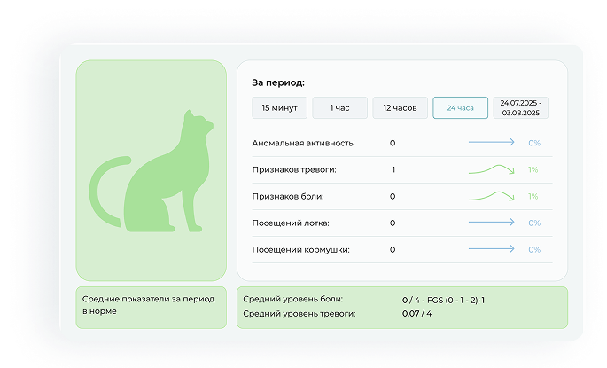 Превратите домашнюю камеру в 24/7 монитор здоровья. Получайте полный отчет о состоянии питомца и удобные уведомления в случае проблем